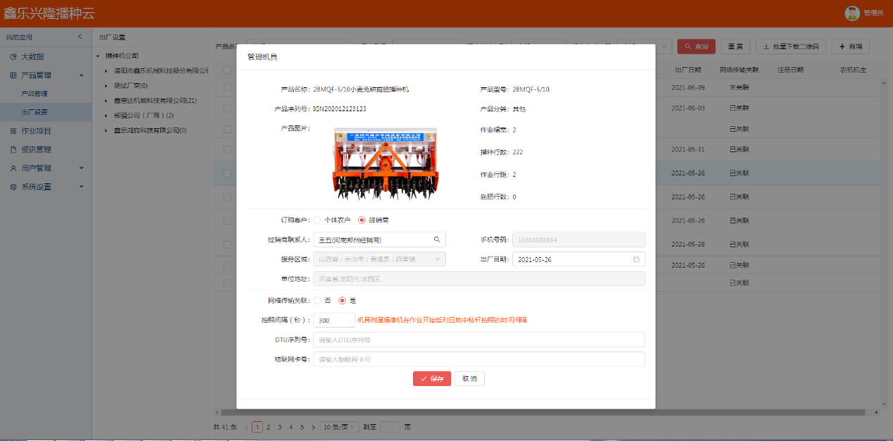 - 作業(yè)項(xiàng)目:為播種機(jī)(農(nóng)機(jī))生產(chǎn)廠家和播種機(jī)(農(nóng)機(jī))經(jīng)銷商提供作業(yè)項(xiàng)目跟蹤服務(wù)的功能。