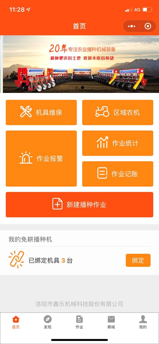 - 首頁(yè):為登錄用戶提供創(chuàng)建作業(yè)、機(jī)具維保、區(qū)域農(nóng)機(jī)、作業(yè)報(bào)警、作業(yè)統(tǒng)計(jì)及作業(yè)記賬等重點(diǎn)功能的快捷入口。