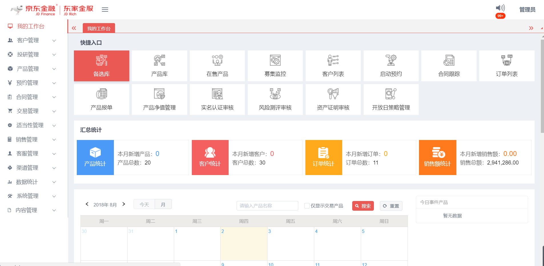 - 我的工作臺:提供系統(tǒng)菜單快捷入口,統(tǒng)計(jì)核心業(yè)務(wù)數(shù)據(jù)及開放期內(nèi)的產(chǎn)品日歷事件展示