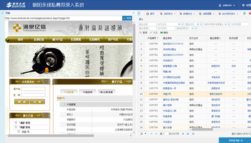 朝陽(yáng)永續(xù)私募雙錄入項(xiàng)目是重構(gòu)項(xiàng)目,主要用來(lái)實(shí)現(xiàn)基于金融報(bào)告等的數(shù)據(jù)的錄入、校對(duì)。系統(tǒng)實(shí)現(xiàn)了管理員對(duì)錄入和校對(duì)人員進(jìn)行授權(quán)并對(duì)錄入人員進(jìn)行分組,錄入人員1和錄入人員2使用平臺(tái)錄入數(shù)據(jù),校對(duì)人員進(jìn)行校對(duì)、扣分、一致提交入庫(kù)等操作。系統(tǒng)通過(guò)雙錄入和校對(duì)機(jī)制從而減少了數(shù)據(jù)錄入的錯(cuò)誤率,提高了數(shù)據(jù)準(zhǔn)確性。
