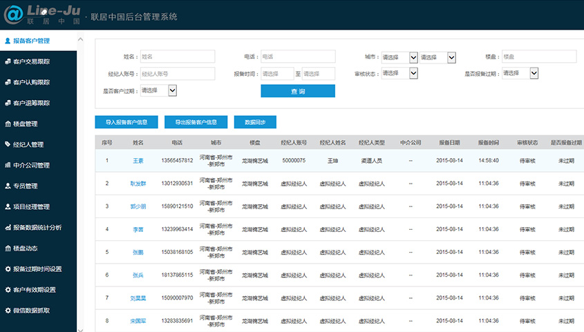- 分角色功能: 系統(tǒng)劃分為不同的角色,根據(jù)角色不同,登錄系統(tǒng)使用的額功能不同。經(jīng)濟(jì)人主要用來(lái)報(bào)備客戶信息;專員用來(lái)判定客戶的有效性;項(xiàng)目經(jīng)理查看客戶的統(tǒng)計(jì)信息;中介公司也用來(lái)推薦客戶信息