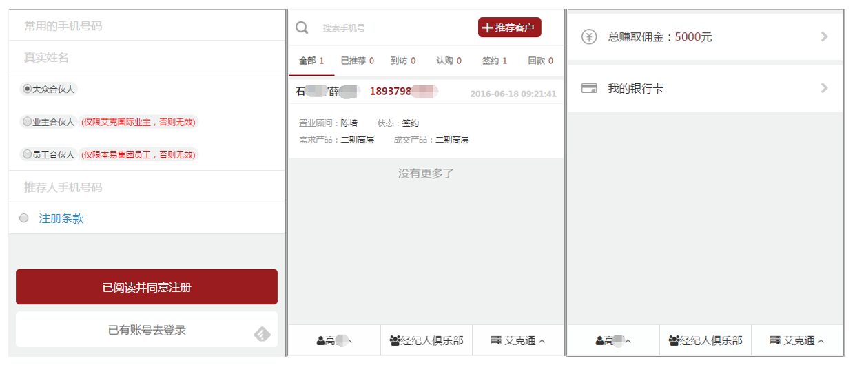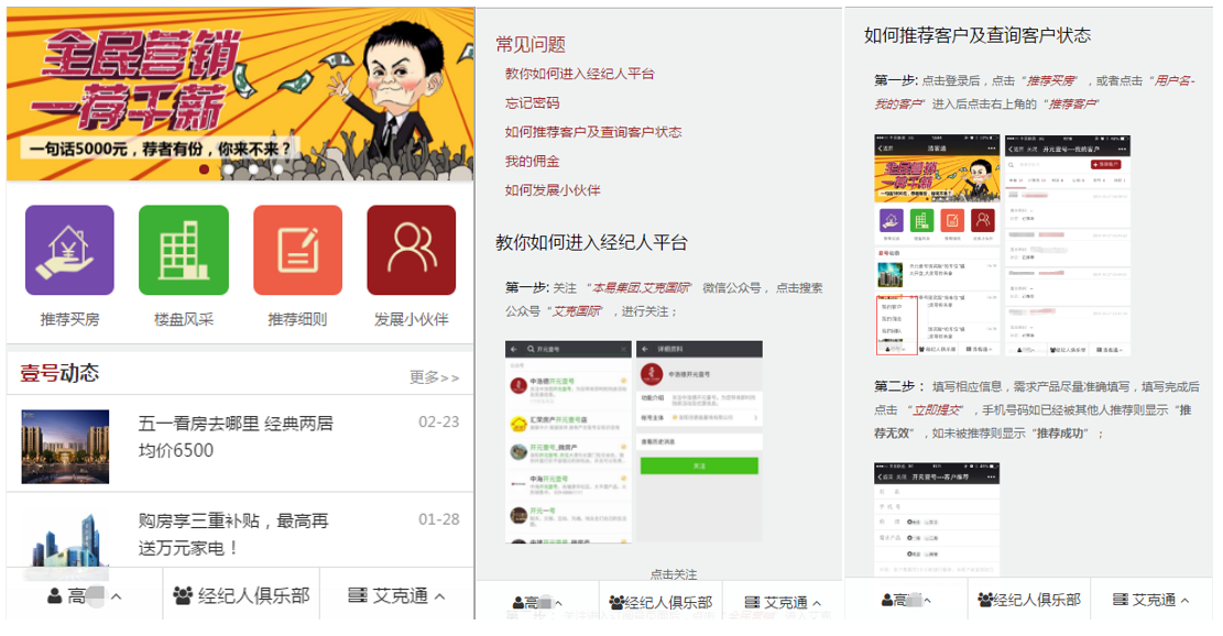 客戶注冊:擁有微信并關(guān)注公眾號,即可注冊申請成為全民營銷系統(tǒng)的用戶(全民經(jīng)紀(jì)人)。注冊用戶可隨時通過微信查看已經(jīng)推薦的客戶信息、購房進(jìn)度、傭金結(jié)算情況。